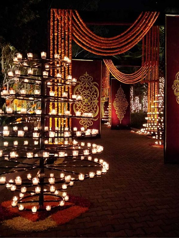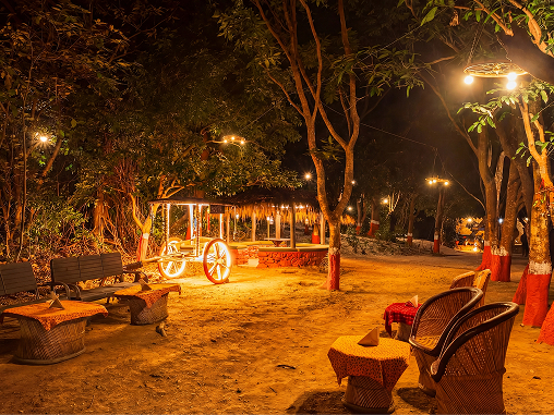 Chahpani is a quaint, open-air setting, imagined as a rustic wooden stall nestled amidst nature. With simple benches, tree-stump seating, and a forest floor softened by gently rustling leaves, it offers a warm, informal space for relaxed hi-teas and intimate wedding moments. As late afternoon light turns the sky a rich burnt orange and the surrounding foliage glows gold, Chahpani comes alive with the comforting aroma of simmering tea. Welcomed by the cheerful dhabawala, guests gather here for easy conversations, light bites, and unhurried pauses, making it a soulful interlude within a Paatlidun wedding.