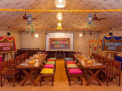 Nestled amidst natural splendour, the amphitheatre offers a deeply immersive setting for wedding ceremonies and sacred pherās. Surrounded by lush greenery and open hill views, this open-air venue features natural acoustics that beautifully carry wedding chants, vows, and live music. As family and friends take their seats along the stone-tiered layout, the bride and groom remain at the heart of the celebration, framed by the wilderness beyond. Ideal for sun-lit daytime rituals as well as intimate evening ceremonies under the stars, the amphitheatre blends tradition, nature, and romance to create truly unforgettable wedding moments.