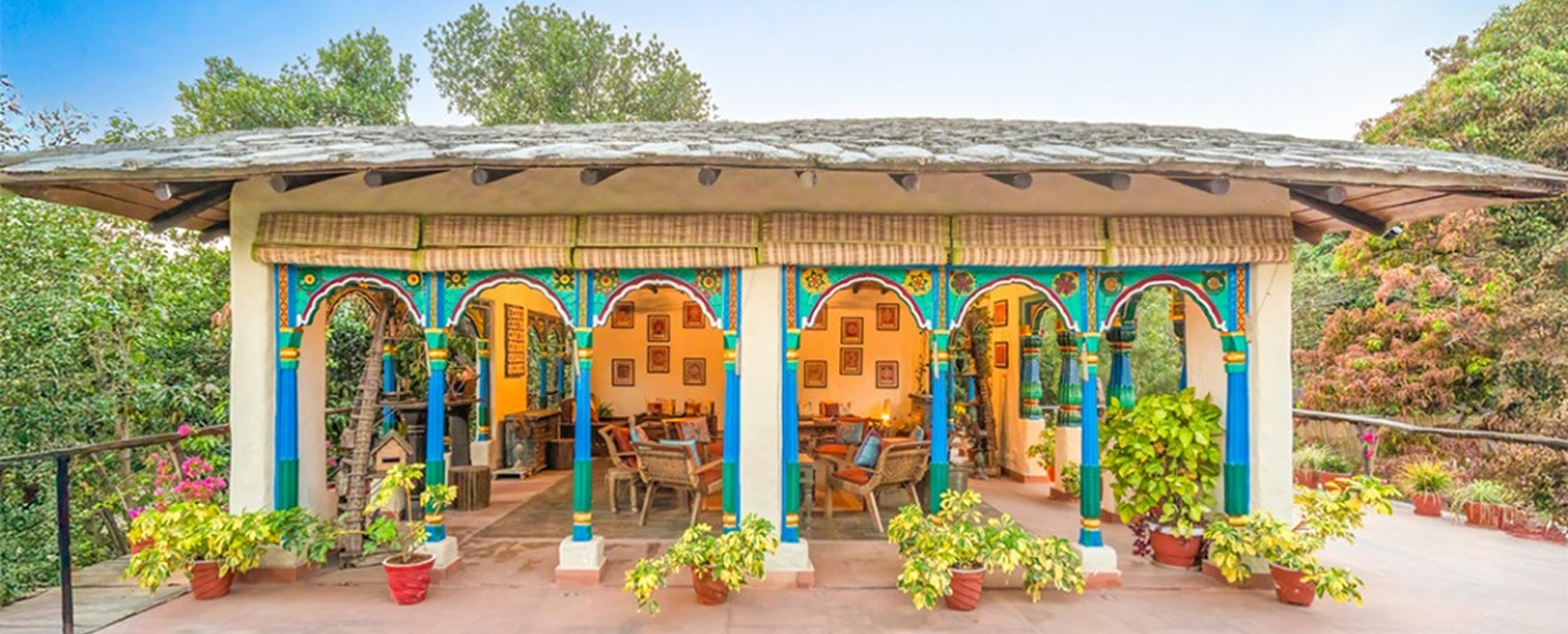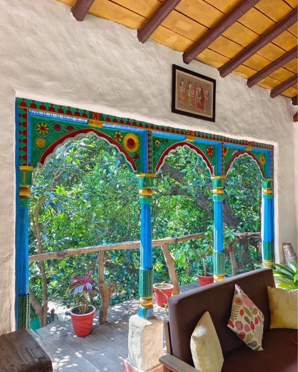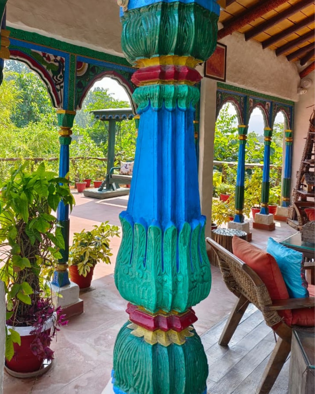 As you wander the forest trails near the wild heart of Corbett, something timeless catches your eye, a vivid green doorframe, a carved pillar in peacock blue, the gentle wash of ochre red arching above a verandah. These colors don’t just decorate- they speak.
