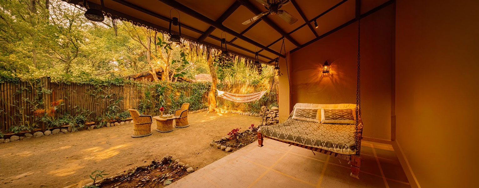 Every corner is designed to immerse you in the forest’s rhythm — a swinging khat to laze upon, a wood-fire nook that warms cool evenings, and a private jacuzzi under the stars. The room itself feels like a sanctuary, where handcrafted furniture, earth-toned fabrics, and natural textures come together to create harmony with the wilderness outside.