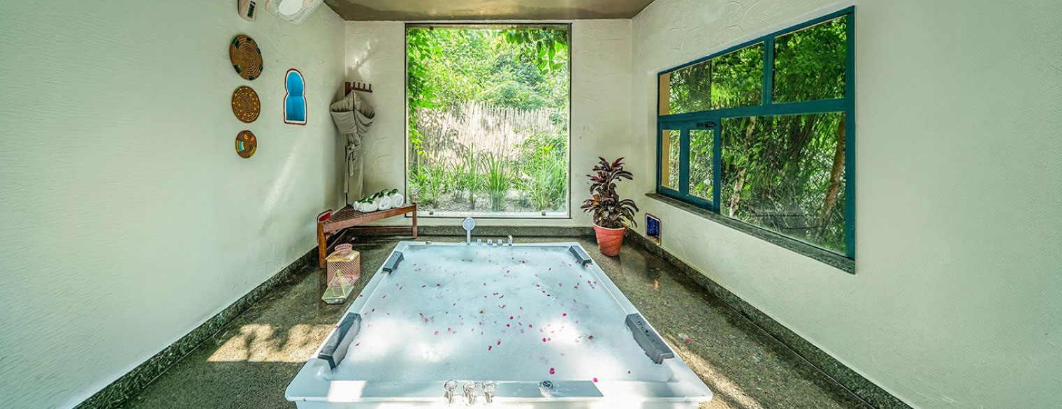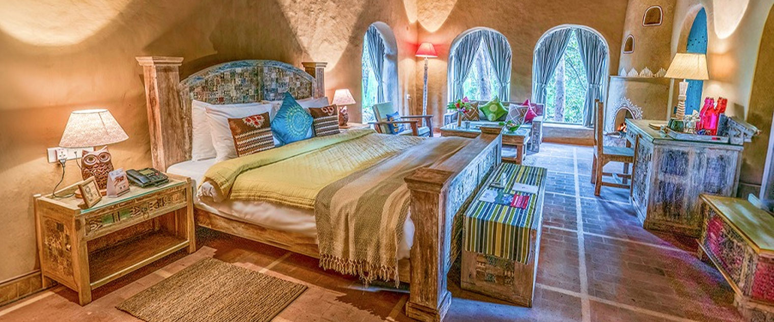 A two-bedroom villa with nursery, jacuzzi, open showers, and a private terrace with jhula, your home in the heart of the jungle. Paatlidun Mud Kothi, 5000 sq. ft., offering unparalleled luxury and comfort amidst nature.