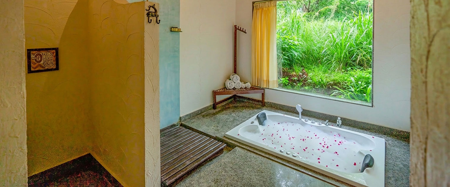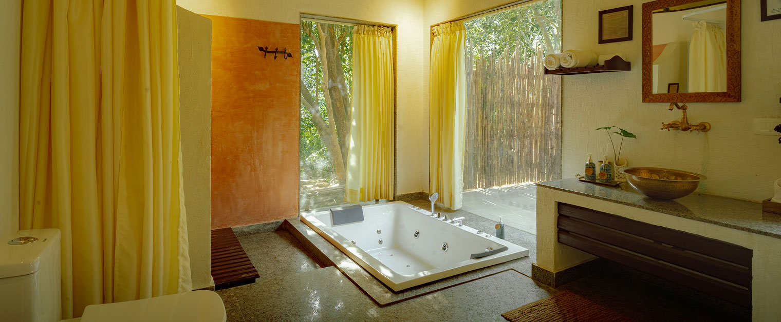 Learn MoreBird Villa - 1500 sq. ft. with Mud Villa and Jacuzzi. Melodic charm, serene comfort, jacuzzi, open shower—echoing wilderness freedom and tranquil escape.