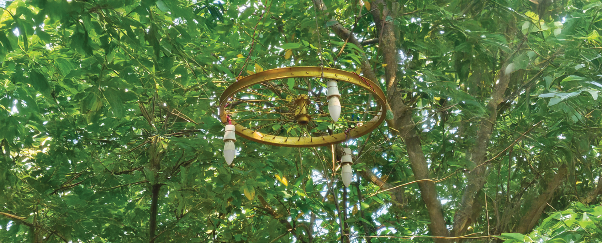 Tucked away in a forested corner of Uttarakhand, creativity flourishes quietly, away from the spotlight. A liquor bottle becomes a planter. A cracked lantern dangles like poetry from a mango branch. A cycle wheel, rusted at the rim, holds three soft bulbs and hangs like a modern sun from the trees.